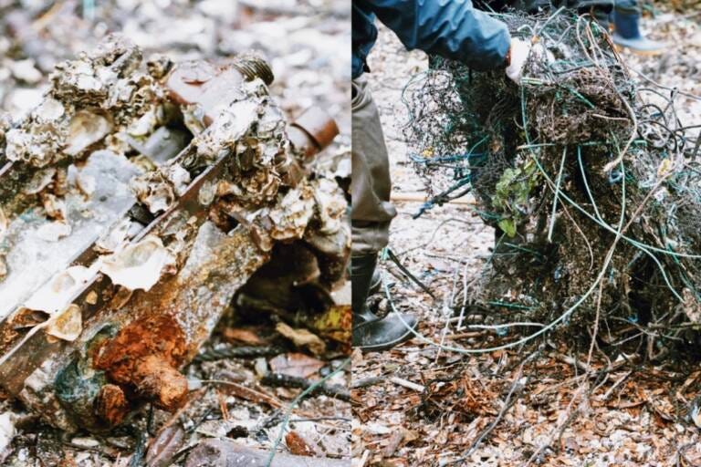 バールは養殖に欠かせない道具ですが、破損して流出すれば海洋プラスチックごみとなります。結局、その日だけで回収したバールは約250個。船と岸を何度も往復し、山のように積み重ねられた白い塊は、非常に衝撃的な景色でした。