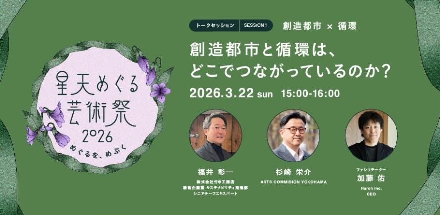 本セッションでは、創造都市と循環をテーマに、横浜市芸術文化振興財団にて「アーツコミッション・ヨコハマ(ACY)」を立上げ、横浜の創造都市施策を形作ってきた杉崎栄介さんと、2025年10月にオープンした新たな創造界隈拠点「BankPark YOKOHAMA(旧第一銀行横浜支店)」を運営する竹中工務店にて、同社のサーキュラーデザインビジョン・戦略「サーキュラーデザインビルド®」を推進する福井彰一さんをゲストに招き、文化・芸術と循環が都市の中でどのように交じりあい、そのあいだにどのような可能性がめぶくのか、皆様と議論を深めていきます。